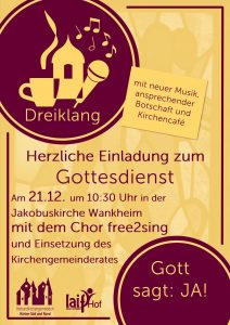 Die neuen Kirchengemeinderäte der Verbundkirchengemeinde werden im Rahmen des Dreiklanggottesdienstes am 21. Dezember um 10.30 Uhr durch Pfarrerin Magdalena Beyer eingeführt. In diesem Gottesdienst werden auch die alten Kirchengemeinderäte verabschiedet. Herzliche Einladung zu diesem besonderen Gottesdienst.